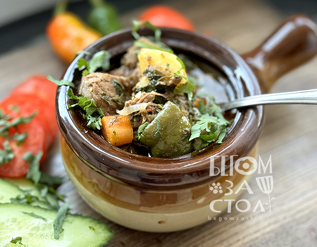 Популярное блюдо грузинской кухни, имеющее множество аналогов у целого ряда народов и стран. Жаркое, тушеное мясо с овощами, считается крестьянской, домашней едой, символом сытной трапезы у простых людей в кругу семьи, так как любое жаркое - это еда, дающая много энергии, что важно для людей, занимающихся физическим трудом. А еще это всегда доступные продукты, меняющиеся от сезона или региона, и чаше всего подобные кушанья готовили в больших казанах, чтобы накормить как можно больше людей, в том числе и на праздниках. Чанахи тоже является по сути гениальным блюдом в своей простоте, с букетом традиционных пряностей, символом домашнего уюта и гостеприимства Грузии.