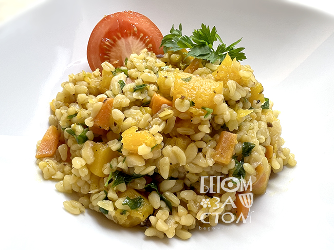 Перемешать, накрыть крышкой и тушить все до готовности булгура. Он должен впитать в себя всю воду. Если воды не осталось, а крупа еще не готова, долить еще немного горячей воды. .