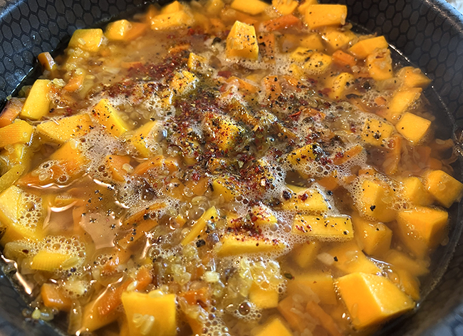 Залить содержимое горячей водой так, чтобы она покрывала крупу. Добавить специи: соль, перец, паприку и другие любимые ароматные травы.