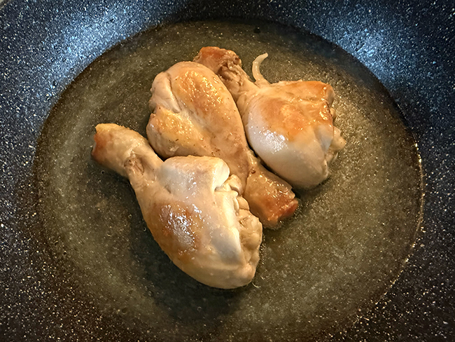 На растительном масле быстро обжарить с двух сторон курицу, и залить 200 мл кипятка.