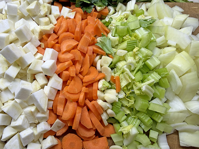Все овощи нарезать одинаковыми кубиками. Куриное мясо снять с костей и тоже нарезать.