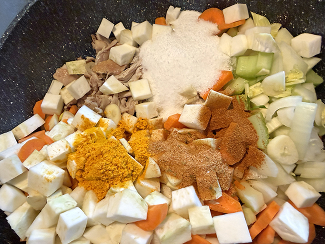 Положить все в кастрюлю с остатками бульона, добавив 80 грамм соли (это не ошибка, готовим концентрат, поэтому соли много). 1 ч л молотого перца, куркумы, чили, всего, что покажется уместным.