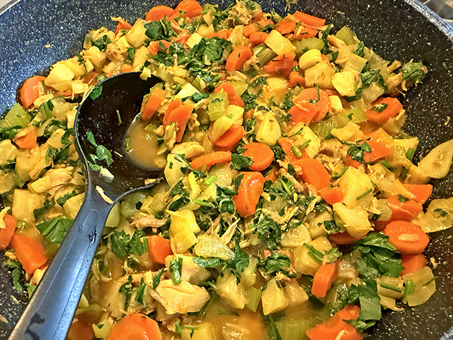 Перемешать и подождать, пока не начнет выделяться жидкость из овощей. Накрыть крышкой и тушить 10 минут до мягкости. Засыпать нарезанную петрушку, перемешать и дать полностью остыть.