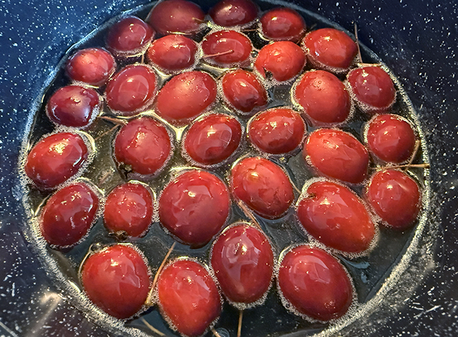 Отобрать целые плоды, очистить от листьев, оставить плодоножки. Каждое яблочко наколоть в трех местах зубочисткой (если этого не сделать. они лопнут, как у меня, нужно накалывать обязательно).