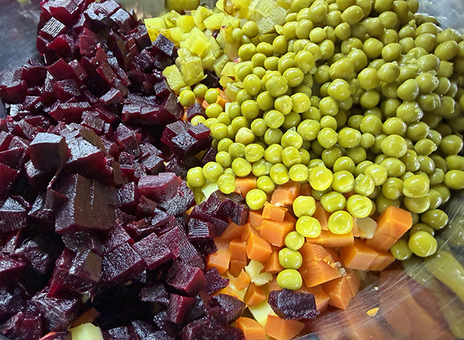 Самая популярная холодная закуска русской кухни — это конечно же винегрет. Наш аналог изысканных картофельных салатов ничуть не хуже, а порой даже и лучше. Оказывается, рецептов винегрета довольно много, любимый рецепт у каждого свой, и, разумеется, он является самым вкусным и правильным. Мой любимый винегрет скорее классический, именно такой — яркий, красный и нарядный, заслуженно украсит новогодний стол наравне с традиционными закусками.