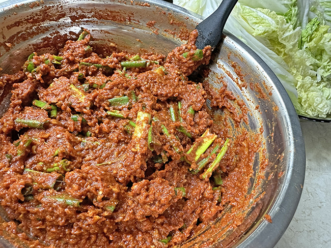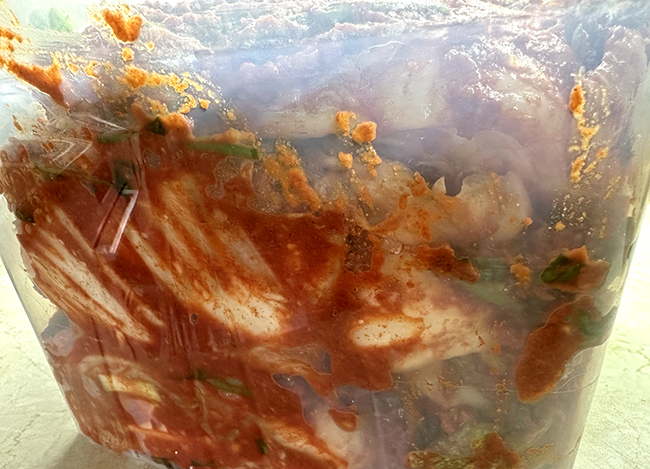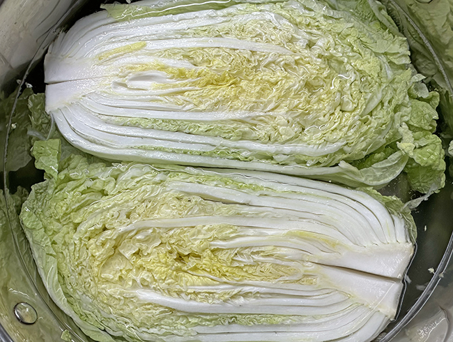 Капусту хорошо промыть от соленой воды. Корейцы делают это в огромных тазах, полощет ее, словно белье. Но можно и просто под краном с проточной водой. Откинуть на дуршлаг, дать стечь воде.