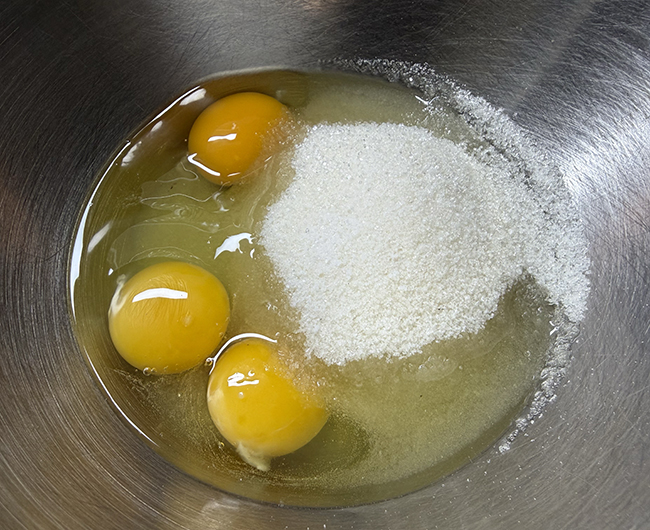 Взбить добела яйца с сахаром и ванилью.