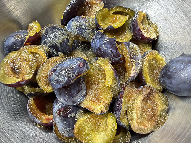 Удалить из слив косточки, разрезав пополам, смешать с сахаром и алкоголем.