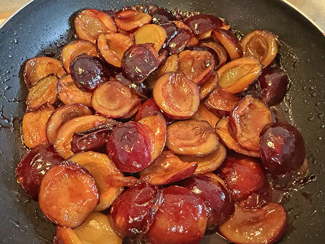 В сковороде растопить сливочное масло и немного потушить сливы, чтобы сахар растворился, а сливы обрели красный оттенок, но при этом не сильно потеряли форму.