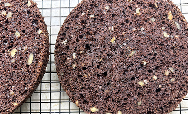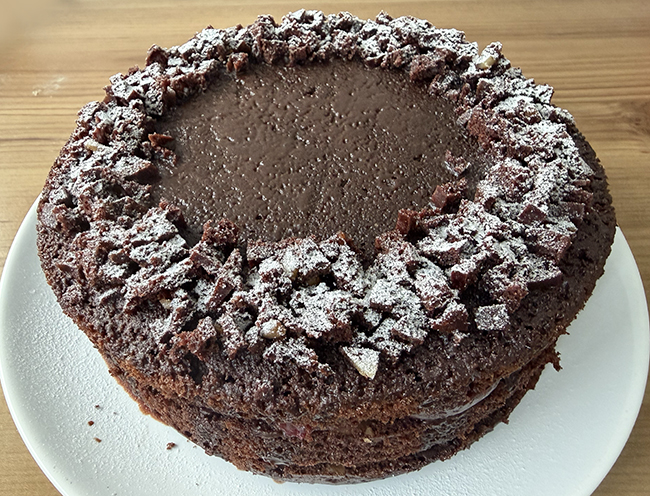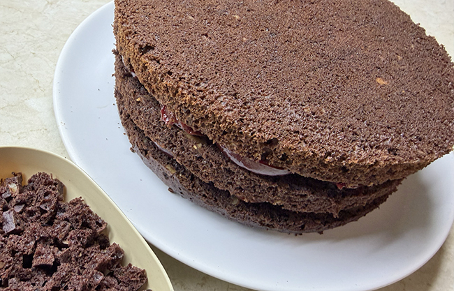 Пропитка будет впитываться в тесто, так и должно быть. Накрыть следующим коржом и все повторить. Холмик бисквита, который срезали, мелко нарезать ножом.