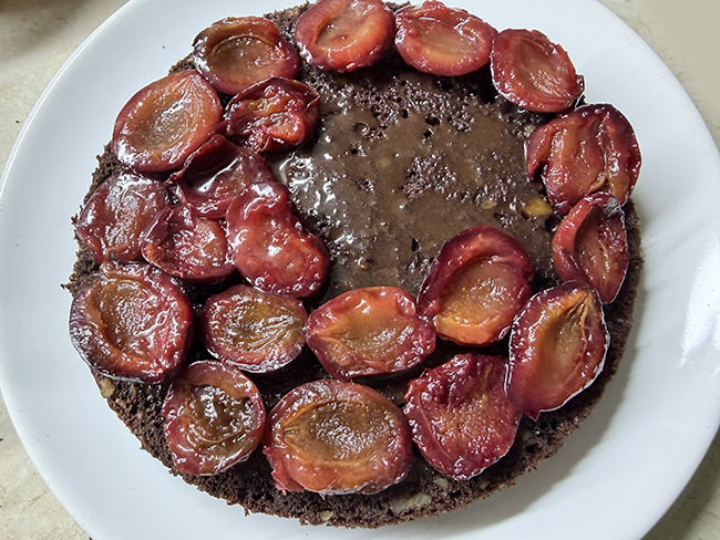 Смазать ею корж, выложить слой слив.