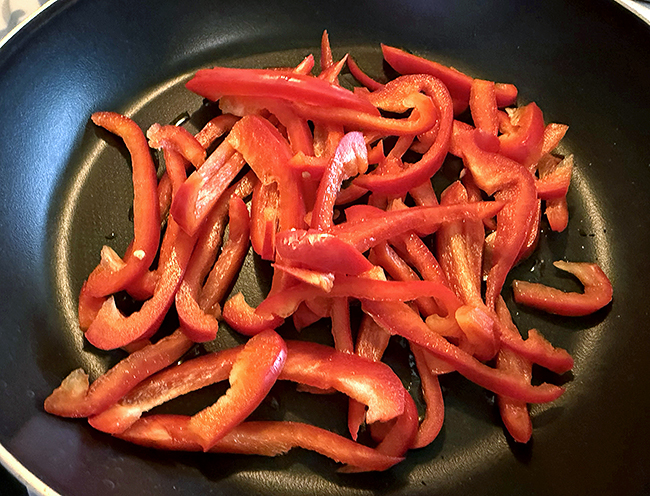 Красный сладкий перец нарезать полосками и обжарить на оливковом масле до готовности.