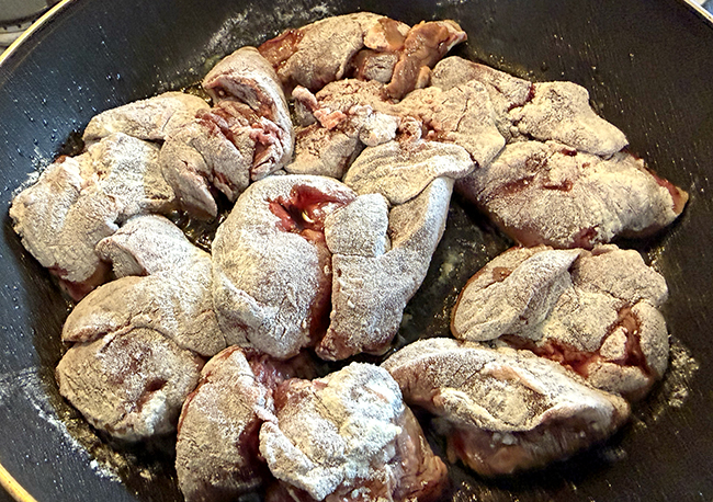 Куриную печень обвалять в муке и обжарить с двух сторон на той же сковороде, где жарился перец, добавив растительного масла. В конце — посолить.