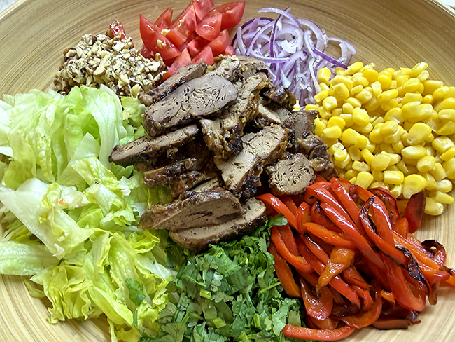 Все остальные ингредиенты нарезать произвольно, горсть орехов порубить, из банки кукурузы слить жидкость. Печень нарезать ломтиками.