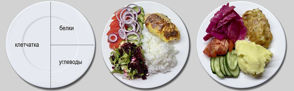 Тарелка диаметром 22-24 см, делится на три части: 1/2 — клетчатка (овощи, фрукты, зелень, тушеные, сырые, запеченые), 1\4 — белки (мясо, рыба, яйца, бобовые, молочные), 1/4 — сложные углеводы (крупы, мучное, картофель). Это один прием пищи, сколько их всего в день — индивидуально, кому как по количеству калорий положено.