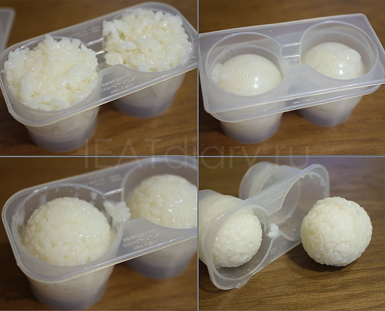 Формочки для онигири у меня двух видов — традиционные треугольники и колобки. Формочки наполняют рисом, в центр риса кладут начинку (как правило это морепродукты), затем плотно прижимают крышкой и — онигири готовы. Сегодня начинку я не клала, так как для рыбного супа — это лишнее. Очень вкусно — рисовый колобок с теплым супом.