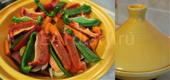 Довести все до кипения, накрыть крышкой и поставить тажин на медленный огонь томиться на 3 часа. В процессе крышку не открывать.