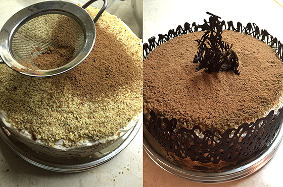 Бока обмазать оставшимся кремом. Посыпать верх какао через ситечко.