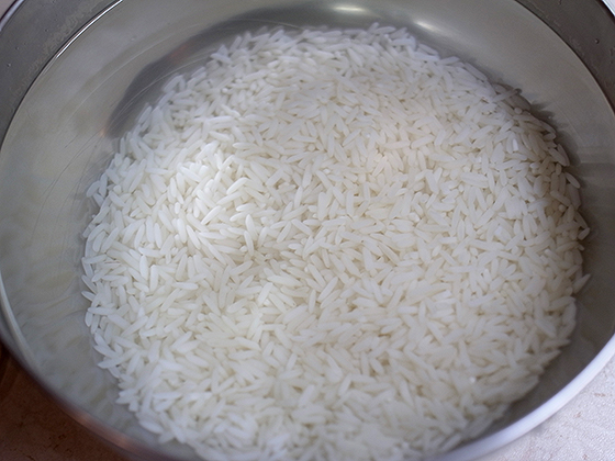 Рис берем длиннозерновой, например, басмати. Его нужно очень хорошо промыть, чтобы вода стала такой чистой, что ее можно было бы пить. Затем залить рис теплой водой, градусов 50 и оставить. Рис разбухнет и побелеет, впитывая воду.