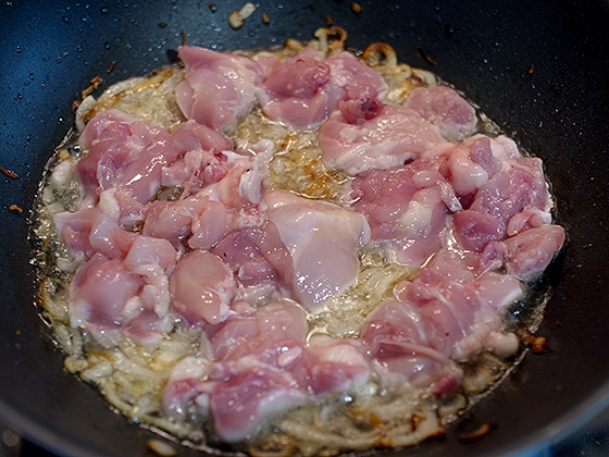 Добавляем мясо, нарезанное на куски среднего размера. Обжариваем, не накрывая крышкой. В идеале — это должна быть баранина. Но и свинина, и телятина, и даже курица — всё в итоге будет вкусно.