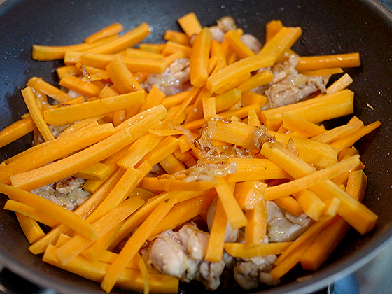 Морковь наезаем соломкой и добавляем к мясу с луком. Слегка обжариваем все вместе, минут пять.
