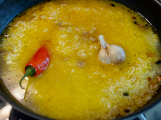 Можно засыпать наш рис. Он пролежал в воде примерно два часа, разбух, поэтому с ним нужно обращаться очень аккуратно, чтобы не поломать. Просто засыпать его сверху, разровнять. Долить горячей воды так, чтобы жидкость покрывала его на 2 см. Сделать углубление в рисе и положить острый перчик и целую головку чеснока. Накрыть крышкой и оставить еще примерно на час. Периодически нужно смотреть — если вода вся впиталась, а рис еще сырой — долить еще кипятка, аккуратно, по стенке жаровни.
