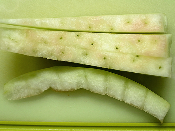 Начинаем готовить с вечера, примерно за 4 часа до сна. Из арбуза 6,5 кг получается 2 кг корок. Их нужно хорошо очистить от розовой мякоти. Овощечисткой удалить зеленую кожуру.