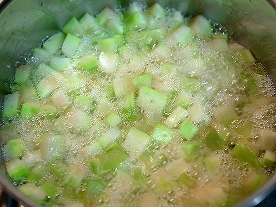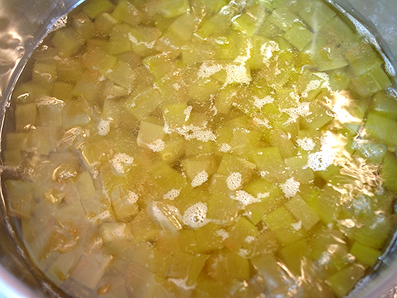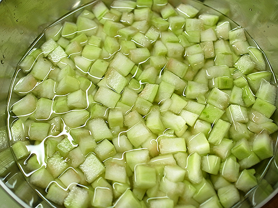 Для того, чтобы кубики не разварились, а сохранили форму и хрусткость, нужно их замочить в содовом растворе. На 1 л холодной воды — 1 ч л соды. Замачиваем на 3 часа.