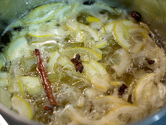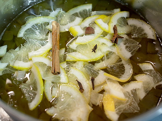 Спустя 4 часа добавляем тонко порезанные дольки лимона с кожурой, палочку корицы, бадьян, бутоны гвоздики.