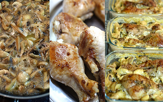 Заранее разогреть духовку до 180º. Выложить соус с грибами в форму для запекания, затем погрузить в соус курицу так, чтобы он покрывал курицу наполовину.