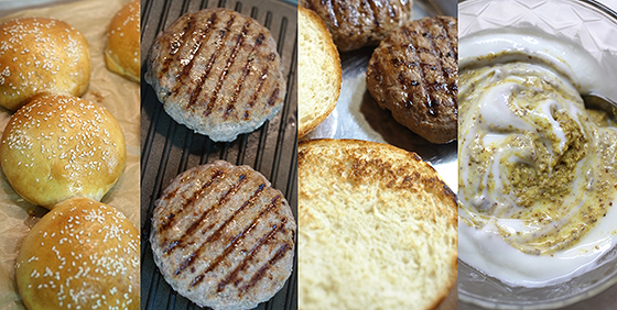 Начинаем собирать бургер. Для этого булочки разрезать и положить на сухую сковороду срезом вниз. Чтобы соки и соусы не размочили хлеб, нужно слегка его зажарить.