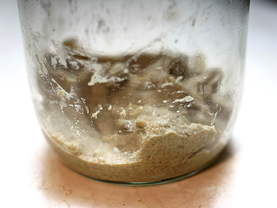 Чудесным образом изменился и вид закваски и ее запах. Появились явные кислые нотки. Это означает, что молочнокислые бактерии начали свой рост, а гнилостные — умерли. В этот момент можно закваску покормить: 50 г ржаной муки и 50 г теплой воды. Все перемешать, закрыть и убрать на прежнее место.