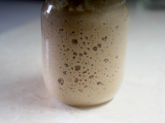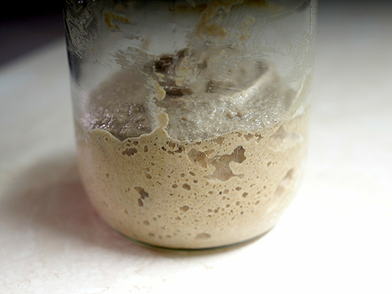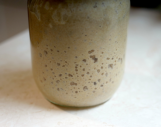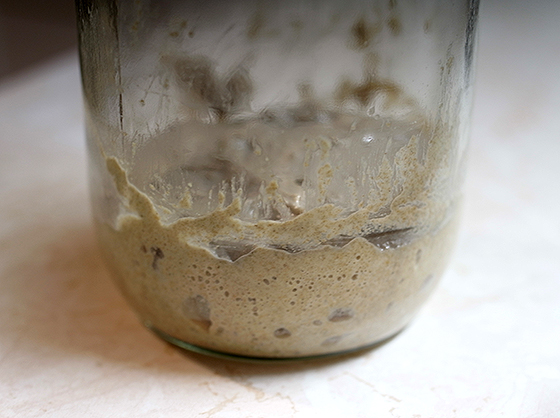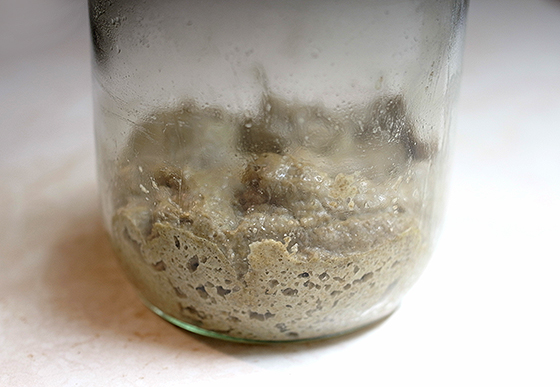 Тесто начало жить, появились явные признаки роста дрожжей — пористость. Кормим снова: по 50 г ржаной муки и воды.