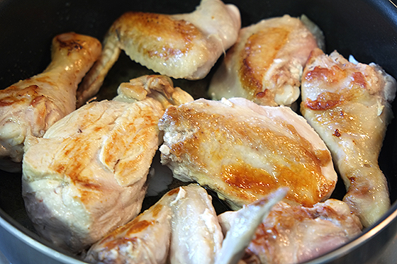 Столовую ложку сливочного масла растопить в глубокой сковороде и обжарить куски курицы с двух сторон до румяной корочки.