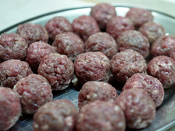 200-300 г говядины прокрутить с небольшой луковицей. Хорошо отбить руками фарш и скатать фрикадельки.