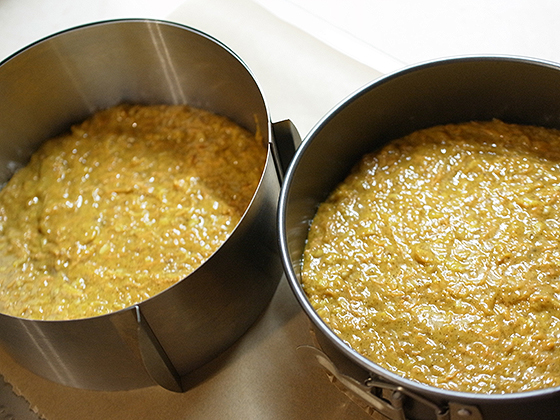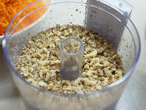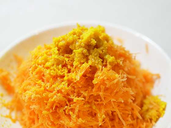 Морковь натереть на мелкой терке, смешать с цедрой апельсина. Отжать сок, чтобы тесто не вышло клеклым.
