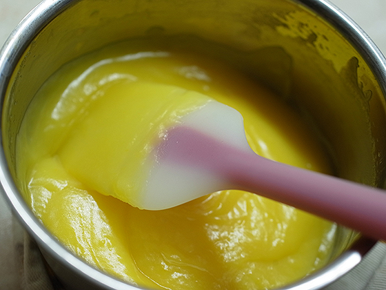 Довести до кипения на медленном огне, постоянно помешивая, затем остудить до 75 градусов. Желатин замочить на 10 минут и добавить в курд, перемешать до растворения желатина.