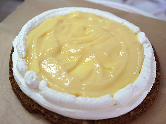 Нанести слой крема, сделать бортик, внутрь выложить курд.