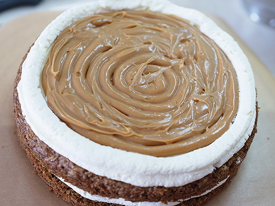 Накрыть следующим коржом, снова крем, ботик и слой карамели внутрь.