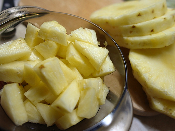 Ананас очистить, нарезать кольцами, затем кусочками 3 см.