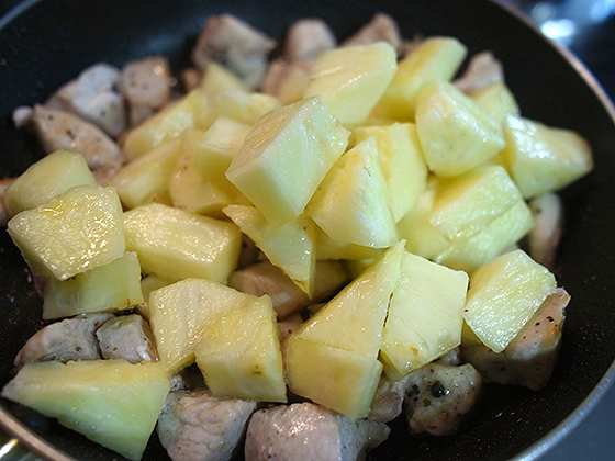 Перемешать и тушить все вместе минут пять на среднем огне. Сахар в ананасе карамелизуется и блюдо окрасится в золотистые оттенки.