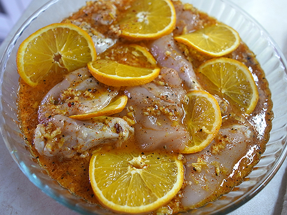 Куски курицы посолить, поперчить и разложить в форме для запекания. Вылить сверху маринад. Апельсин нарезать колечками и разложить сверху. Поставить на 1-2 часа в холодильник.