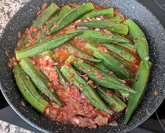 Выложить бамию в соус, накрыть крышкой и тушить минут 20 на медленном огне до мягкости плодов. Следить, чтобы жидкость не испарилась полностью, если нужно, подлить немного воды.