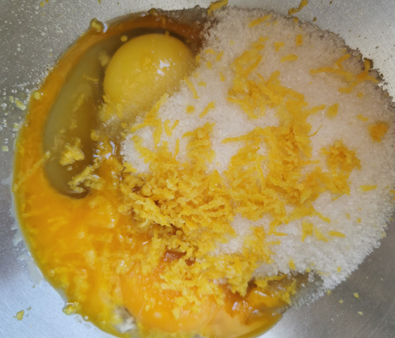 Яйца взбить с сахаром, ванилью и цедрой добела.