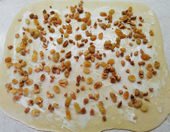 Разделить тесто на 4 равные части. Раскатать тонко каждый кусок, смазать маслом, посыпать изюмом и орехами.