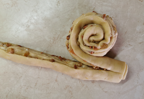 Скатать рулетом по длинной стороне. Прорезать вдоль и скрутить улиткой каждую половинку, начиная с одной, затем продолжая скручивать вторую половинку теста.