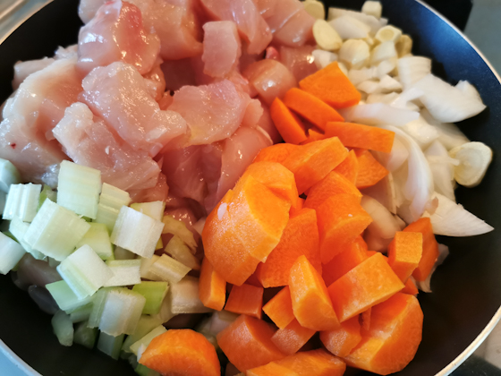 Всё нарезать произвольно, и сложить в глубокую сковороду, добавив немного оливкового масла.