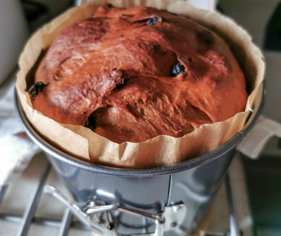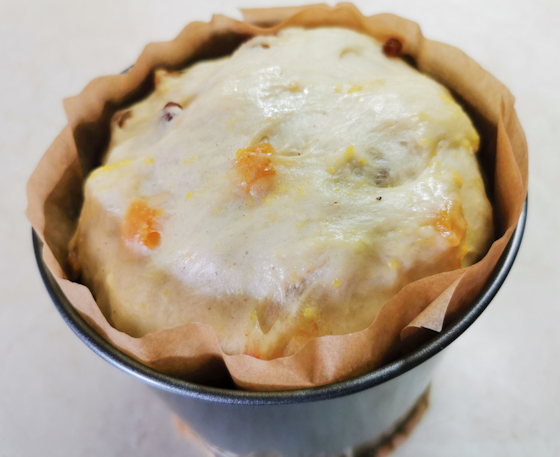 Сложить тесто колобком и поместить в форму для кулича, застеленной пергаментом.