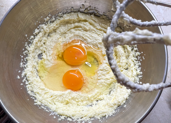 Взбить масло с сахаром и ванилью. Добавить яйца и снова взбить.
