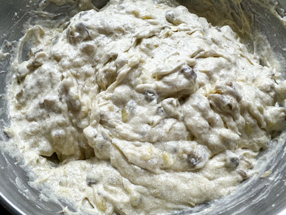 Грецкие орехи порубить ножом и вместе с изюмом добавить в тесто, перемешать.